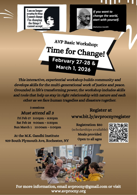 MARCH 10-15, 2026 AVP CULTURES OF JUSTICE AND PEACE WORKSHOP SERIES at ROCHESTER FOLK ART GUILD, MIDDLESEX, NY